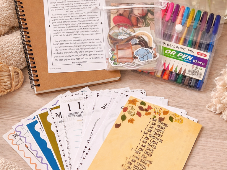 Includes: Blank Journal, pack of Gel Pens, stickers, blank Mindful Journaling templates (designed by Nurture Wellbeing)