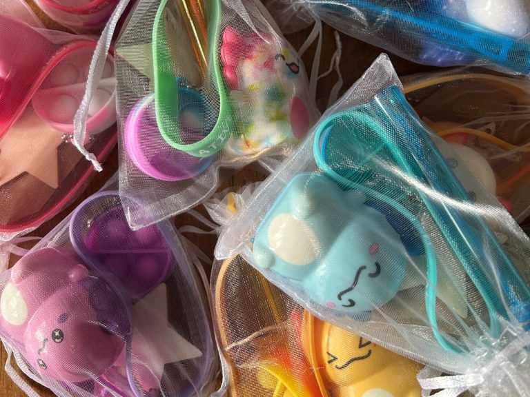 Included in every bag, you will find... Bubbles, to remind you to take long, deep breaths. A wooden star, to support "Star breathing". A squishy toy, to squeeze and release big feelings. A pop-it toy to keep your hands busy and your mind more still. And a positive affirmation bracelet, to remind you how amazing you are! I can provide large orders of these as party favours! Get in touch to enquire.